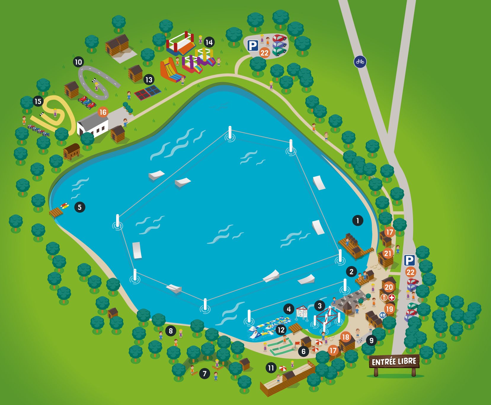 - 1h d'accro sur l'eau et mur d'escalade, 30min d'Aqua Park, tour de bouée, 30min de paddle, 1 partie de mini golf, 1h de jeux pour enfants